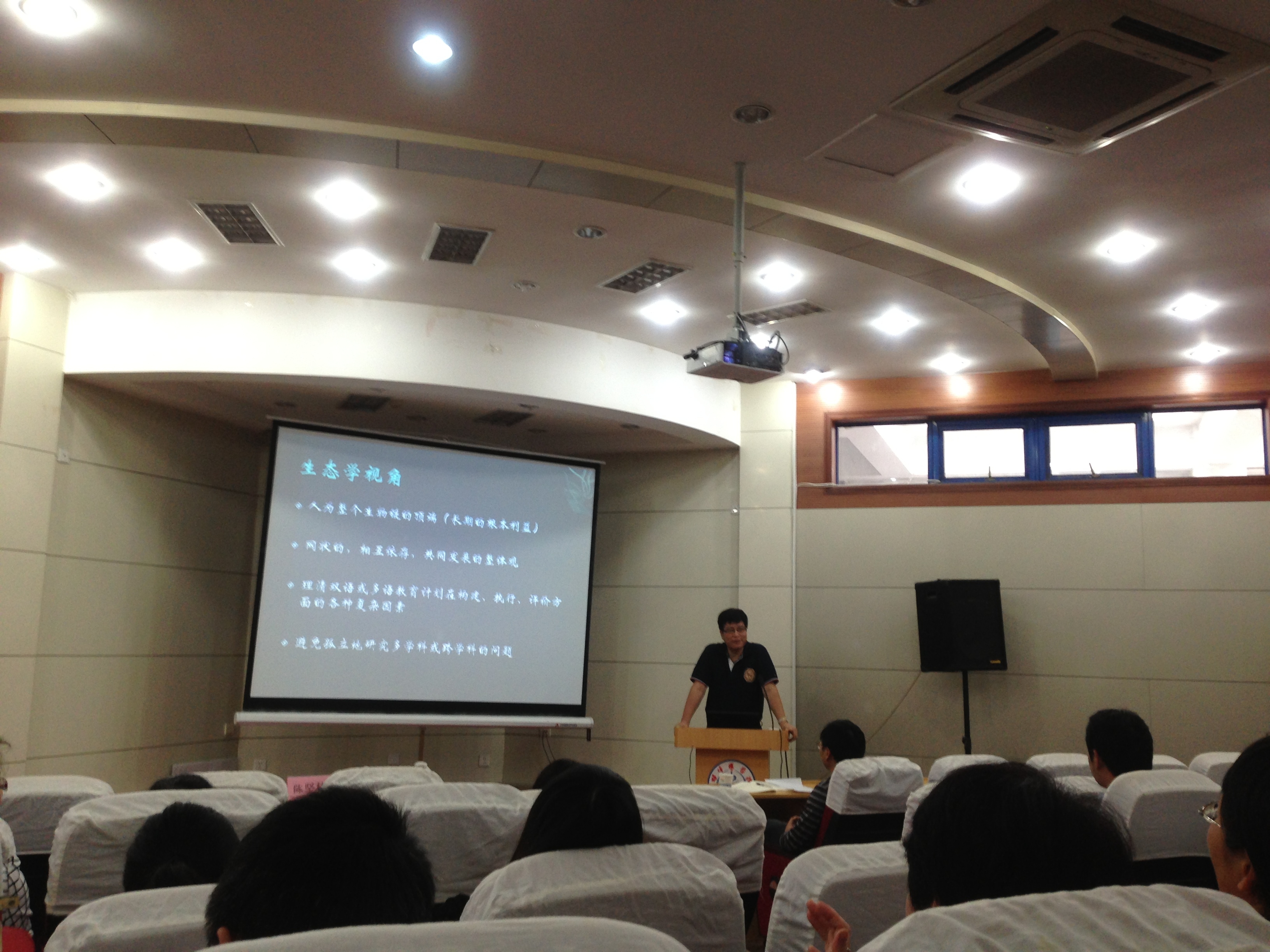 2014924下午3时,应蚌埠医学院公共课程部、必赢唯一官方网站外国语学院邀请,上海外国语大学博士生导师、上海外语音像出版社、上海外语电子出版社社长兼总编辑、国家级外语学术刊物《外语电化教学》副主编——陈坚林教授莅临蚌埠医学院学术报告厅为两校教师做了题为《外语教学的理论支撑》的学术讲座。陈坚林教授阐述了应用语言学、第二语言习得研究、教育语言学的理论,对这些领域的研究在外语教学中的贡献进行了分析,并阐明了它们在外语教学实践中的瓶颈,提出了外教教学研究的的生态学视角。讲座结束后,陈教授对教师现场提出的问题进行了细致的解答。