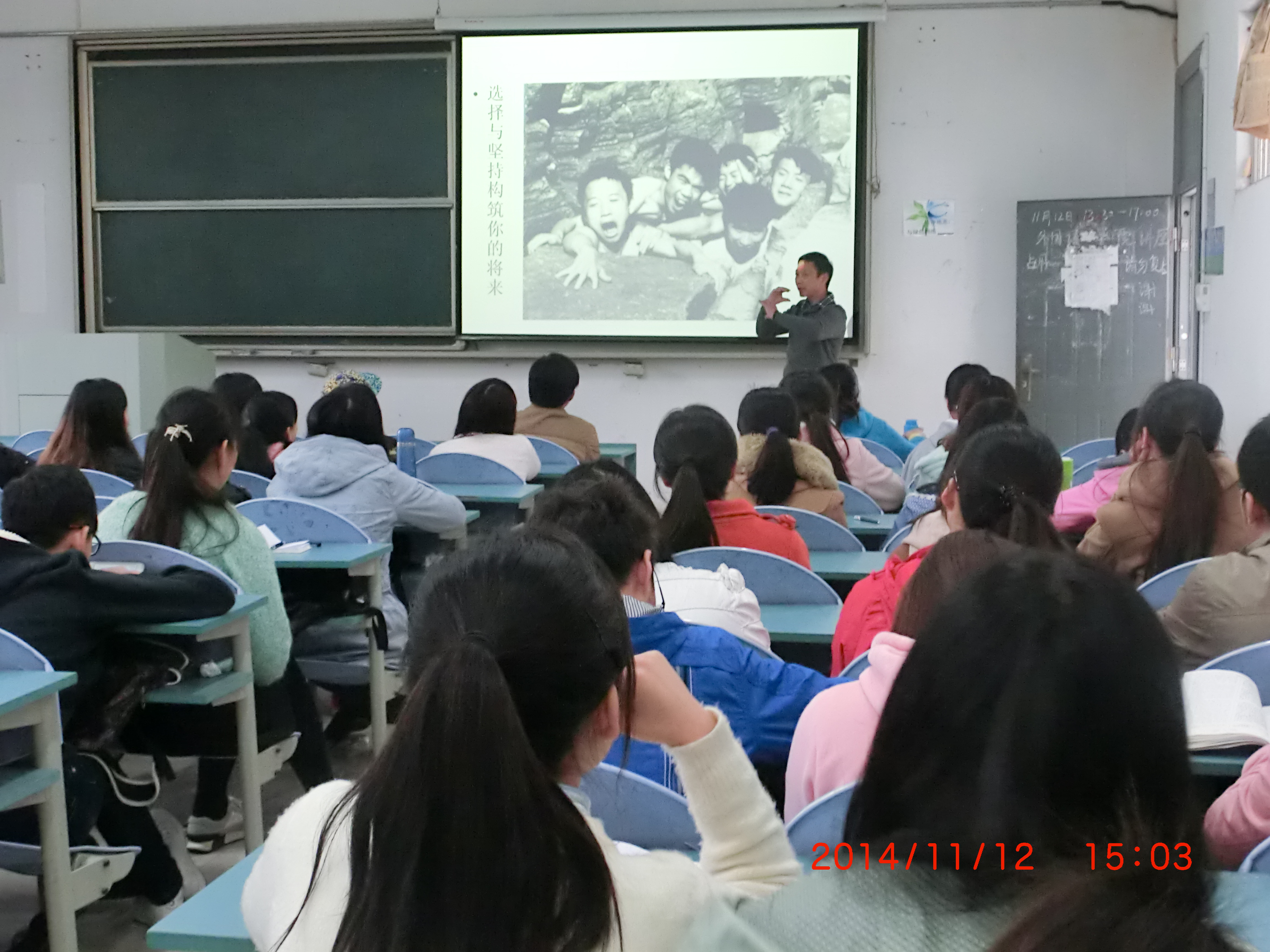 讲座从下午两点开始,地点为3#103教室,出席人员为日语系全体师生和部分英语班学生,讲座共持续两小时。赵教授演讲的主题是“教育创造未来,外语改变人生”,他主要结合自己的传奇人生经历,演绎了学好外语给人生带来的巨大变化。赵教授曾经历经坎坷,他受过两次重伤,患过两次大病,但赵教授始终乐观地面对人生,每一次挫折都促使他获得更大的学术成就。如今赵教授不仅成就斐然,依然精神矍铄。赵教授演讲语言幽默风趣而又令人刻骨铭心,会场从始至终一直沉浸在感动与兴奋的气氛中。演讲结束后,赵教授又回答了学生和老师们提出的关于日本文化、日本留学及日语高效学习方法等问题。赵教授的演讲使大家深刻地理解了“较量,从失败开始”、“选择与坚持构筑你的将来”、“你嘴上的人生就是你的人生”、“挫折乃人生的宝贵财富”、“乐观创造奇迹”等人生哲理。