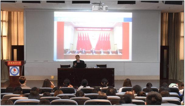 11月8日下午,文学院党委在图书馆报告厅举办“学习领会党的十九大精神 做一名新时代合格大学生”的形势政策报告会 ,2015、2016级学生参加了报告会。院党委书记袁世俊作辅导报告。