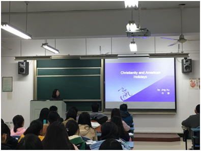 11月22日晚18:30,我院公共外语教学部许静老师在必赢唯一官方网站东校区明德楼412作了题为“Christianity and American Holidays”(《基督教与美国的节日》)的专题讲座。