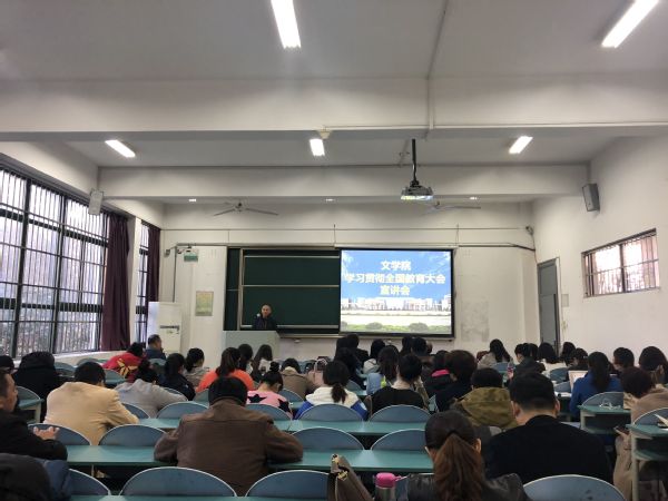 11月9日下午,文学院在慎思楼103召开学习贯彻全国教育大会宣讲会,院党委书记袁世俊为全院教职工作主题宣讲。院长周平、副院长李雪红、朱松林出席大会,院党委副书记刘晓光主持大会。