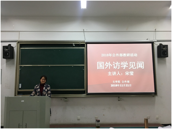 1121日下午,文学院公共外语教学部在慎思楼105教室举行了本学期第二次教研活动。我院宋莹老师结合美国访学经历给公外部老师做了一场题为“美国教育之我见”的讲座。旨在与各位老师交流美国老师如何组织课堂教学活动并给予学生反馈,以及在日常学习中如何加强校园和民族文化教育。之后与各位老师就如何培养学生的自我认同感进行了进一步的互动。