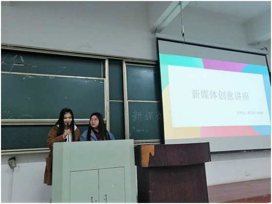 讲座伊始,胡文玲和刘婷婷向大家介绍了H5产品的特点、用途,通过实际案例的展示加深了大家对H5产品的认识。她们和现场同学充分互动,讨论具体案例的创意切入和实施,并在此基础上介绍了新媒体创意大赛的制作工具、参赛流程和注意事项。