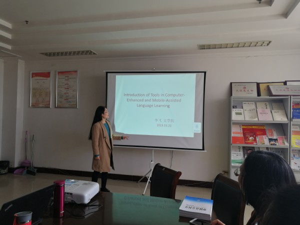 李飞老师做了题为“INTRODUCTION OF TOOLS IN COMPUTER-ENHANCED AND MOBILE-ASSISTED LANGUAGE LEARNING”的讲座,着重介绍了MSU英语语言中心计算机与移动辅助语言学习的开展,以及在我校大学英语教学中此技术的可行性。