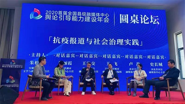 会议包括主题报告、主题演讲、主题交流和圆桌论坛四个环节。文学院朱松林副院长主持了“抗疫报道与社会治理实践”圆桌论坛,与湖北洪湖、四川古蔺、江西共青城、北京丰台、河北香河5家融媒体中心负责人,共同探讨县级融媒体中心如何通过服务大局、服务群众,完善和提升基层社会治理能力等问题。