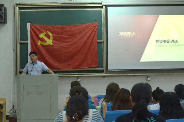 6月30日下午,院党委书记王龙建在明德楼103教室以“《中国共产党章程》的发展历程和现实意义”为题为新党员上党课,51名预备党员聆听党课。