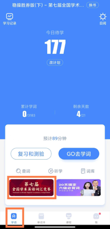 2. 在学词界面找到学术大赛的入口,点击进入