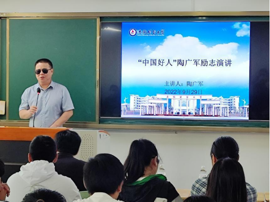 2022年9月29日下午3点,“中国好人”陶广军应邀在通惠楼305教室为文学院师生开展题为《从眼盲到心明》的励志讲座,讲座由院长方军主持,学院主要学生干部参加讲座。