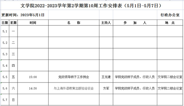 文学院2022-2023学年第2学期第10周工作安排表(5月1日-5月7日)