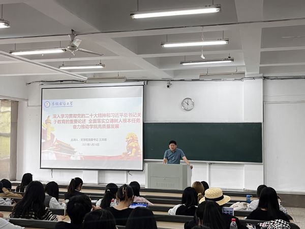 为扎实开展学习贯彻习近平新时代中国特色社会主义思想主题教育,牢牢把握“学思想、强党性、重实践、建新功”总要求,根据学校主题教育安排,5月24日下午,文学院党委书记王龙建在龙湖西校区通慧楼201教室为学生党员讲授题为《深入学习贯彻党的二十大精神和习近平总书记关于教育的重要论述 全面落实立德树人根本任务 奋力推动学院高质量发展》的党课。