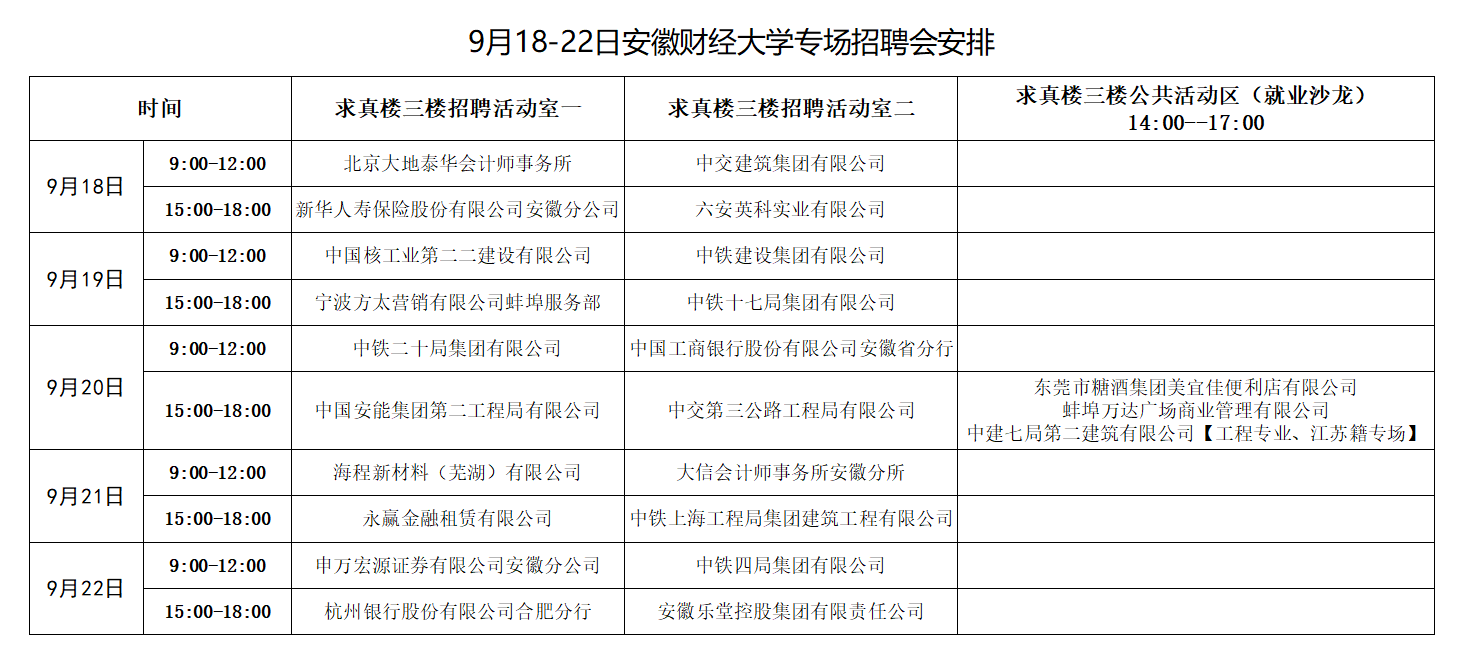 2023年9月18日——22日必赢唯一官方网站专场招聘会安排