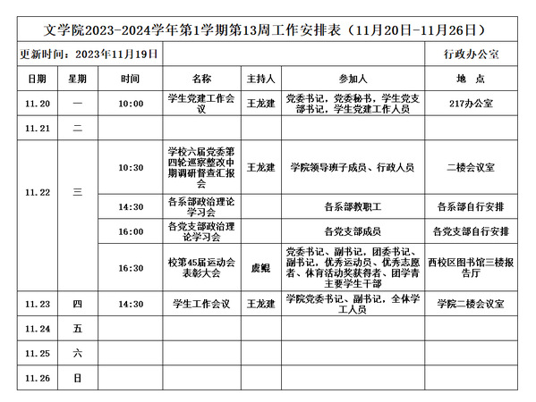 文学院2023-2024学年第1学期第13周工作安排表(11月20日-11月26日)