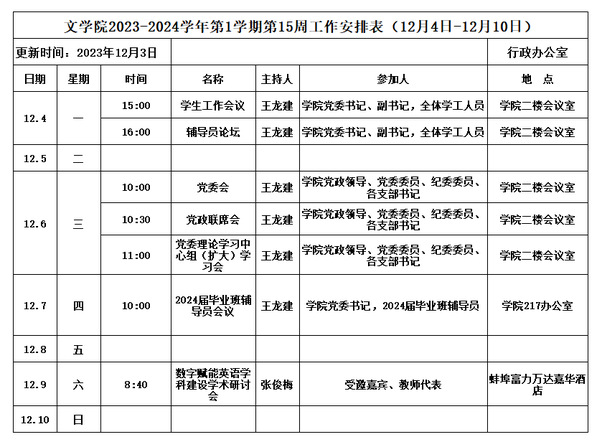 文学院2023-2024学年第1学期第15周工作安排表(12月4日-12月10日)