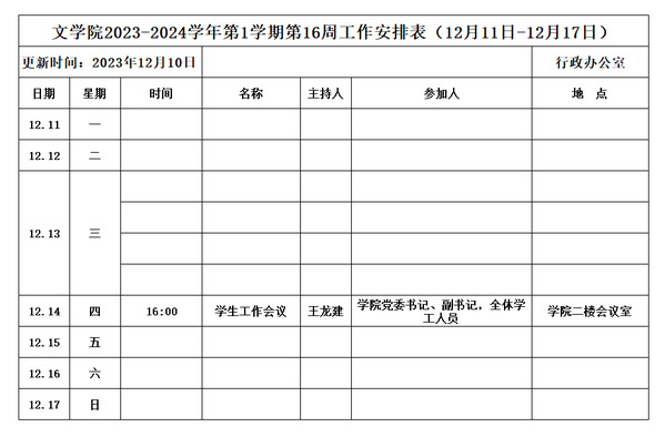 文学院2023-2024学年第1学期第16周工作安排表(12月11日-12月17日)