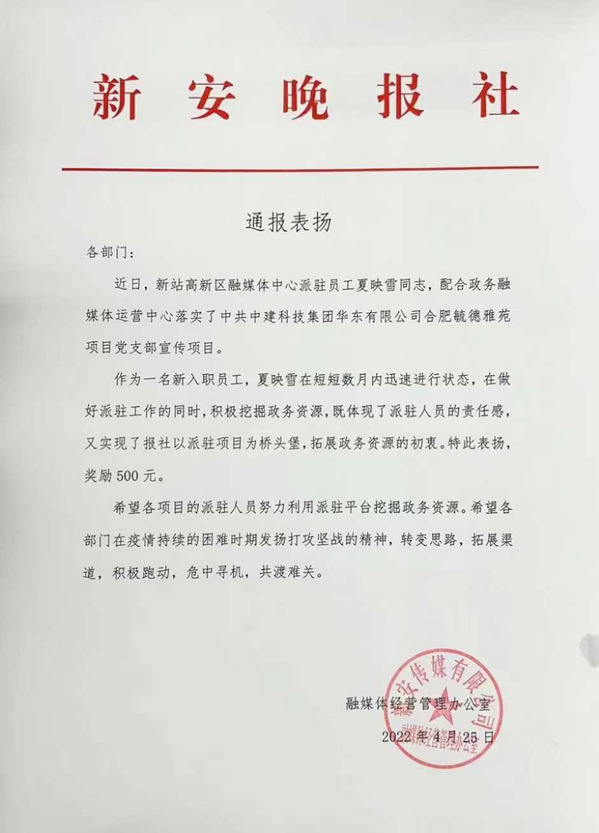 近日,新安晚报社通报表扬了我院新闻传播系2020届校友夏映雪。通报称“作为一名新入职员工,夏映雪在短短数月内迅速进入状态,在做好新站高新区融媒体中心派驻工作的同时,积极挖掘政务资源,既体现了派驻人员的责任感,又实现了报社以派驻项目为桥头堡,拓展政务资源的初衷”。夏映雪在工作中所取得的业绩,反映了我院校友良好的业务素养,为母校赢得了荣誉。