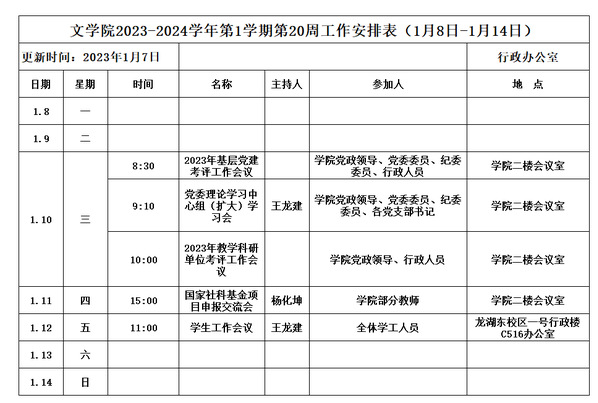 文学院2023-2024学年第1学期第20周工作安排表(1月8日-1月14日)