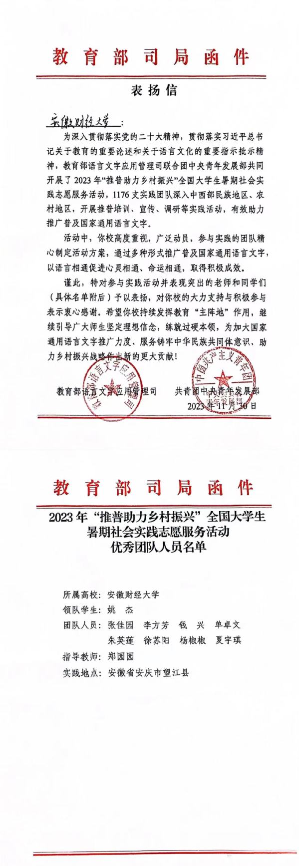 近日,教育部语言文字应用管理司、共青团中央青年发展部共同主办的2023年“推普助力乡村振兴”全国大学生暑期社会实践志愿服务活动评优结果揭晓,我校“推普助力乡村振兴”暑期社会实践团队荣获“优秀团队”称号,同时收到教育部语言文字应用管理司和共青团中央青年发展部的表扬信。