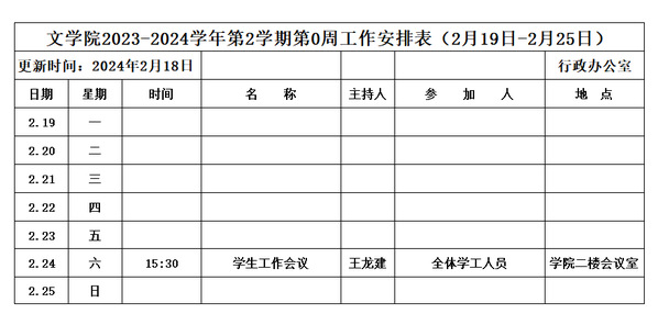 文学院2023-2024学年第2学期第0周工作安排表(2月19日-2月25日)