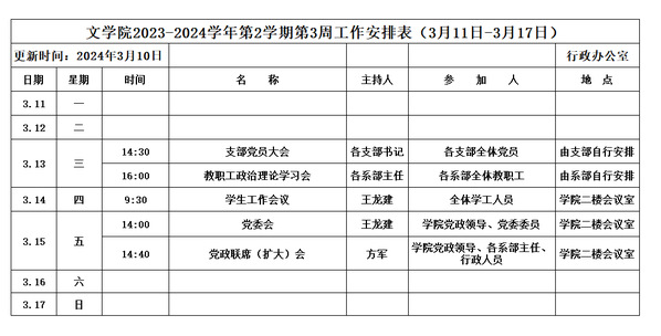 文学院2023-2024学年第2学期第3周工作安排表(3月11日-3月17日)