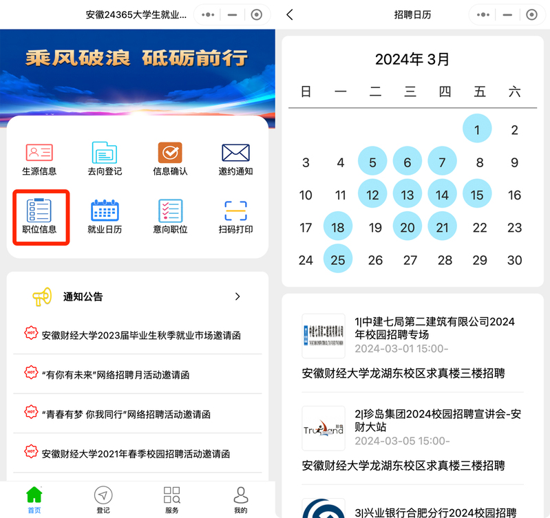 “安徽24365大学生就业服务平台”以信息化手段,提供从就业指导到职位申请等一系列服务,旨在为即将步入职场的毕业生搭建一个全面、便捷的就业信息桥梁。学生绑定微信小程序后即可查看生源信息、去向登记、职位信息、就业日历等,具体功能介绍如下: