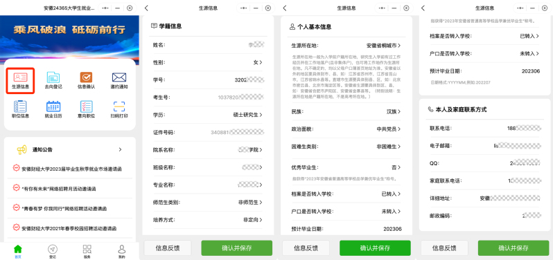 学生核对并填写完整的学籍信息、个人基本信息、本人及家庭联系方式,若信息有误可点击左下角的“信息反馈”申请修改。
