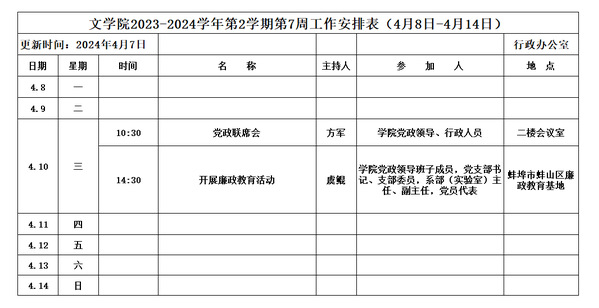 文学院2023-2024学年第2学期第7周工作安排表(4月8日-4月14日)