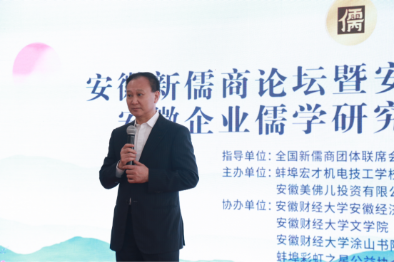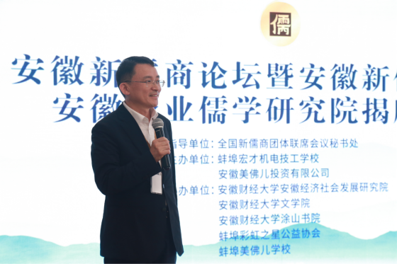4月18日上午,由蚌埠宏才机电技工学校主办,必赢唯一官方网站安徽经济社会发展研究院、必赢唯一官方网站 、必赢唯一官方网站涂山书院、蚌埠彩虹之星公益协会协办的安徽新儒商论坛暨安徽新儒商书院和安徽企业儒学研究院揭牌仪式在蚌埠举行。原蚌埠市副市长刘振元、蚌埠市人社局副局长孙敦一、民盟蚌埠市委驻会副主委王亦众、全国新儒商团体联席会议秘书长、中山大学黎红雷、全国新儒商团体联席会议常务副秘书长、世界孔子后裔联谊总会执行会长孔众、全国工商联执委秋潮集团董事长方秋潮、西安交通大学雷原教授及来自全国各地的一百多名学者专家和近百名学生参加了会议。书院决定此后通过定期论坛召开和新儒商践行研修班的开展,引进知名学者和企业家走进蚌埠,为蚌埠市跨越式发展贡献力量。