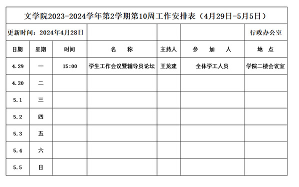 文学院2023-2024学年第2学期第10周工作安排表(4月29日-5月5日)