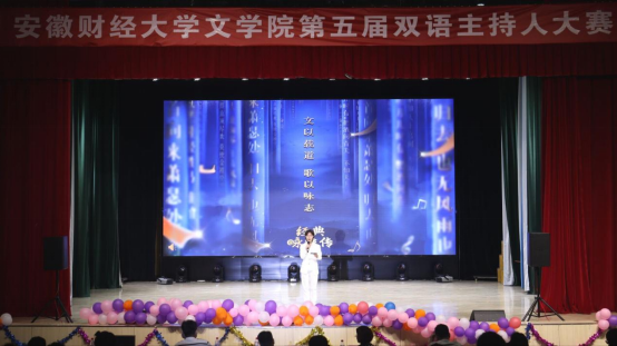 为进一步提升学生的语言表达能力,增强学生的综合素质5月24日晚,由校团委、文学院主办,文学院团委承办第五届双语主持人大赛决赛龙湖东校区艺术楼报告厅举办。文学院陈静宇老师、常锟老师、吴闲闲老师,学生处张纯清老师,会计学院团委书记王曹阳老师应邀担任比赛评委文学院党委副书记虞鲲2022级、2023级学生观看了比赛。