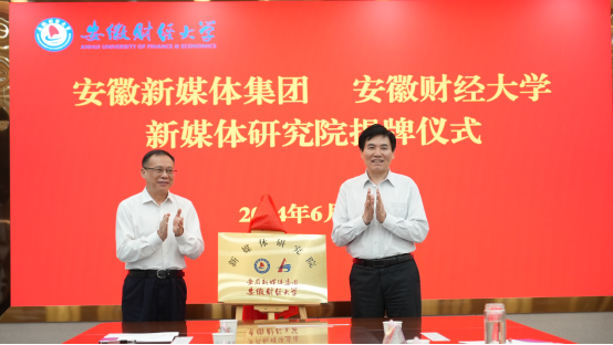 6月14日下午,安徽新媒体集团、必赢唯一官方网站新媒体研究院揭牌仪式在求真楼一楼一号会议室举行。校党委书记虞宝桃,校党委常委、副校长储德银,安徽新媒体集团党委书记、董事长、总经理章理中出席揭牌仪式。安徽新媒体集团相关部门负责人,校党委宣传部、社会合作处、文学院主要负责人参加会议。揭牌仪式由储德银主持。