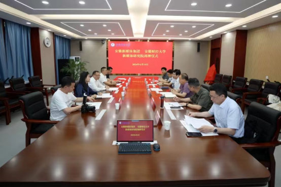 会上,储德银从历史沿革、学科建设、师资队伍、人才培养、科学研究、开放办学等方面对学校进行了全面介绍。文汇传媒有限公司总经理王腾对安徽新媒体集团做了概括介绍,并围绕人才队伍打造、新媒体产业发展等方面对新媒体研究院下一步工作进行了展望。