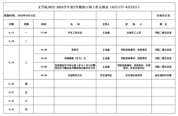 文学院2023-2024学年第2学期第17周工作安排表(6月17日-6月23日)