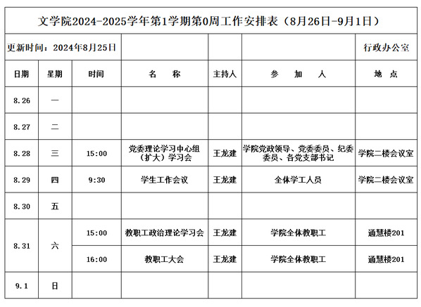 文学院2024-2025学年第1学期第0周工作安排表(8月26日-9月1日)