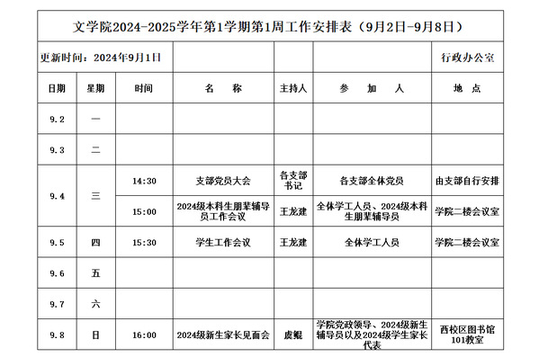 文学院2024-2025学年第1学期第1周工作安排表(9月2日-9月8日)