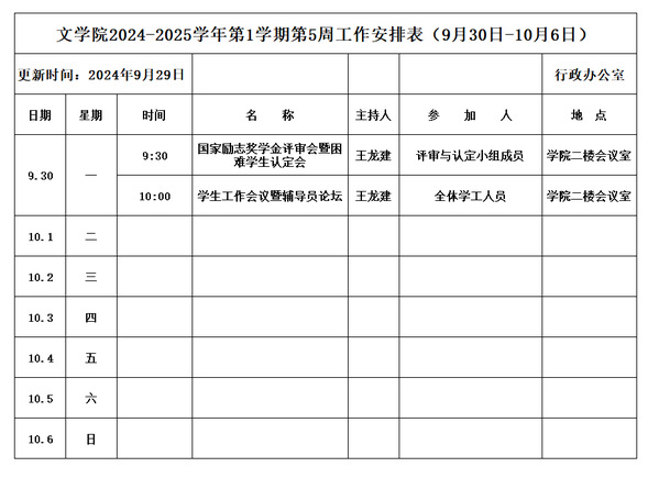 文学院2024-2025学年第1学期第5周工作安排表(9月30日-10月6日)