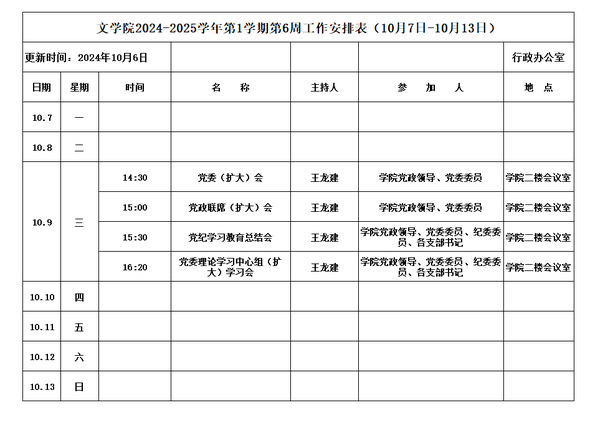 文学院2024-2025学年第1学期第6周工作安排表(10月7日-10月13日)