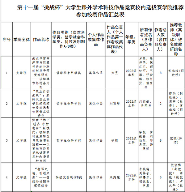 根据《关于举办第十一届“挑战杯”大学生课外学术科技作品竞赛校内选拔赛的通知》要求,经学生申报、学院组织专家进行评审遴选,拟推荐以下4件作品至校团委参加校级复赛评审,现予以公示。
